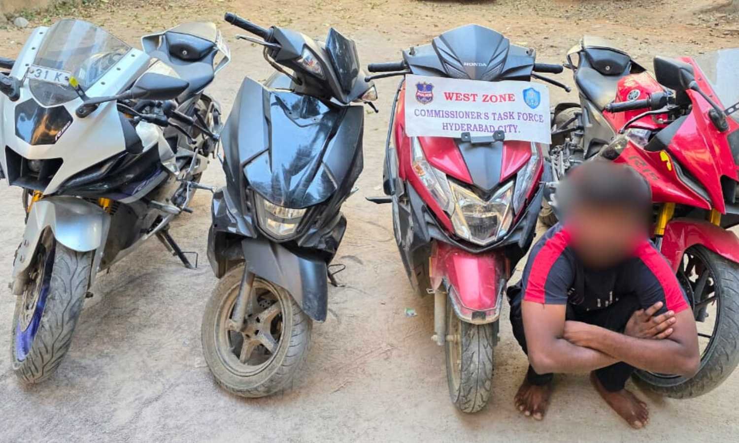 Hyderabad: The Commissioner’s Task Force, West Zone on Thursday arrested a bike theft offender and a juvenile. The team also recovered four stolen motorcycles worth ₹6.5 lakh.